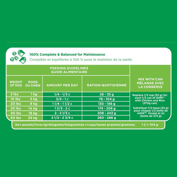 Satisfy your small dog's craving for real meat proteins, and give them 100% complete and balanced nutrition with IAMS PROACTIVE HEALTH Adult Minichunks Dry Dog Food. Our hearty dog food is made with real chicken as the first ingredient. Your active dog's favorite pet food, now in a smaller kibble size, delivers the hearty protein they need to maintain lean muscles. Plus, it includes L-carnitine to help burn fat and promote a healthy metabolism. IAMS PROACTIVE HEALTH Dog Food also is formulated with seven essential nutrients to nourish your dog's heart. Your dog will feel the benefits of our wholesome dog food, and you will notice their healthier skin, shinier coat and reduced tartar buildup. Best of all, IAMS PROACTIVE HEALTH Food for Active Dogs is made without fillers or artificial preservatives, so you can be confident that your adult dog is getting wholesome nutrition in every small bite.