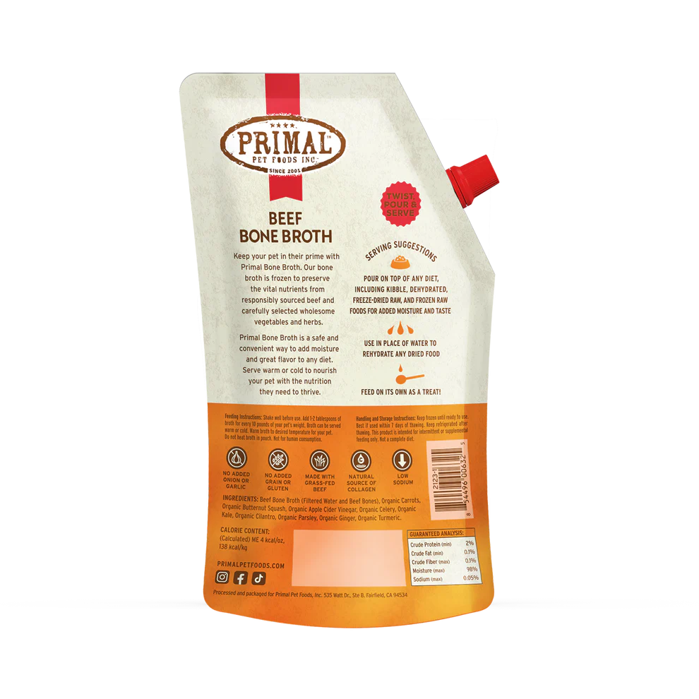 PRIMAL PET FOODS BEEF BONE BROTH IS INTENDED FOR INTERMITTENT OR SUPPLEMENTAL FEEDING ONLY. THIS IS NOT A COMPLETE DIET.